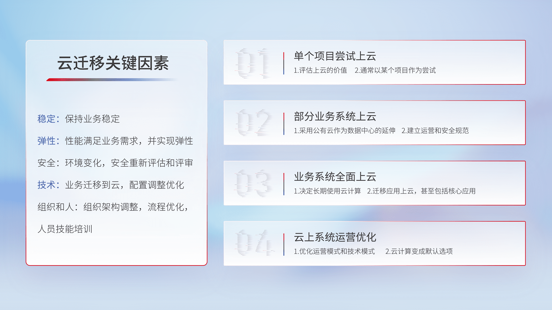 结合实际业务,,,从规划设计、、、、云平台选型、、云原生改造、、、数据迁移、、、集成交付,,,迁移全过程为客户识别最佳上云路径,,,做好风险识别管理,,,,设计网络架构、、、身份权限、、安全审计合规、、、操作审计、、、日志审计、、监控告警策略、、、多站点容灾设计等,,,,对云上基础设施进行整体规划,,,,提升IT治理水平,,,以满足弹性、、、高可用、、、高性能的需求。。。。
