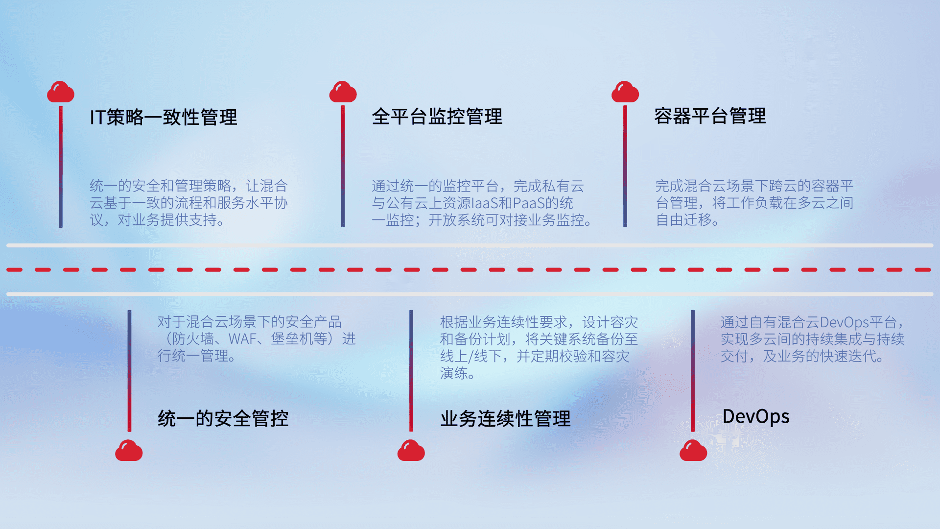 通过多云纳管,,,,以统一的资源数据模型把客户的云资源进行抽象和封装,,,,进而实现对多云资源的统一操作,,,,保障云资源管理的可靠性、、、、稳定性与可用性。。。。量身定制化运维内容,,配置、、开发运维、、、、补丁管理、、、、备份、、、监控、、、认证和访问管理、、、审计和日常巡检等,,,,保障在用云过程中的可靠度,,,,稳定度以及高可用率。。